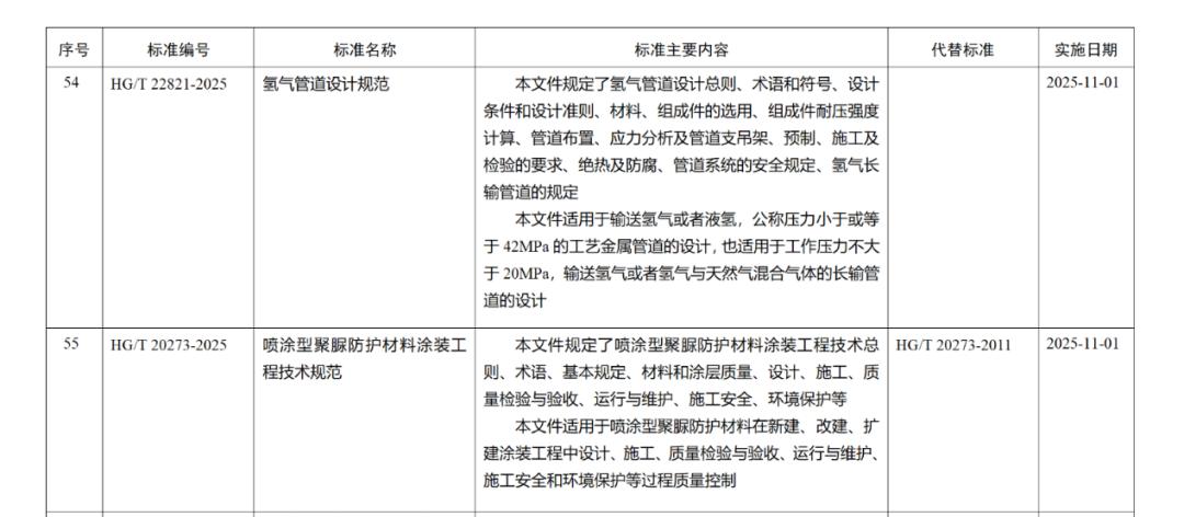 2025年4月10日,中华人民共和国工业和信息化部发布第7号公告:批准《喷涂型聚脲防护材料涂装工程技术规范》HG/T 20273-2025行业标准,并于2025年11月1日起实施。