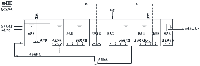 进水首先进入生化池分配井,与来自二沉池回流污泥进行混合,分配至每个系列生化池,在生化池内发生生物脱碳、脱氮反应。在生化池内,污水依次进入缺氧区和好氧区,充分利用缺氧生物和好氧生物的特点,在缺氧区实现反硝化,将大部分硝态氮转换成氮气,缺氧区设置搅拌器,实现进水、污泥与回流液的完全混合。缺氧区出水通过管道重力流至好氧区,在好氧区去除大部分CODcr,同时将大部分氨氮转换成硝态氮,使污水得到净化,好氧区所需空气由鼓风机提供,好氧区池底布置旋流曝气器。本项目进水氨氮高,为防止游离氨对硝化菌的活性抑制,好氧区内设置多段式气提系统,形成好氧区内水流的循环流动。好氧池设内回流泵以将含硝态氮混合液回流至缺氧池进行反硝化反应。