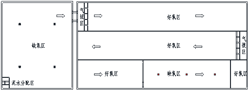 生化池沿水流方向分为:缺氧区-气提区-好氧区-气提区-好氧区-兼氧区-好氧区,兼氧区除布置了搅拌器外,还布置了曝气系统,可实现缺氧区与好氧区的切换运行。从而保证生化池可以以A/O和两级A/O两种模式运行,提高了对水质波动的应对能力的同时也节约了药剂消耗。