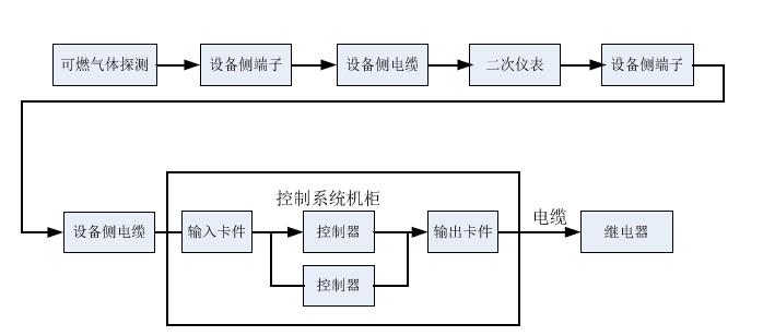 可燃气体探测——》设备侧端子——》设备侧电缆——》二次仪表——》设备侧电缆——》控制系统机柜:对外接线端子排——》防浪涌——》开关端子排——》输入卡件——》PLC——》输出卡件——》开关端子排——》防浪涌+继电器——》对外接线端子排——》电缆——》继电器(启风机)