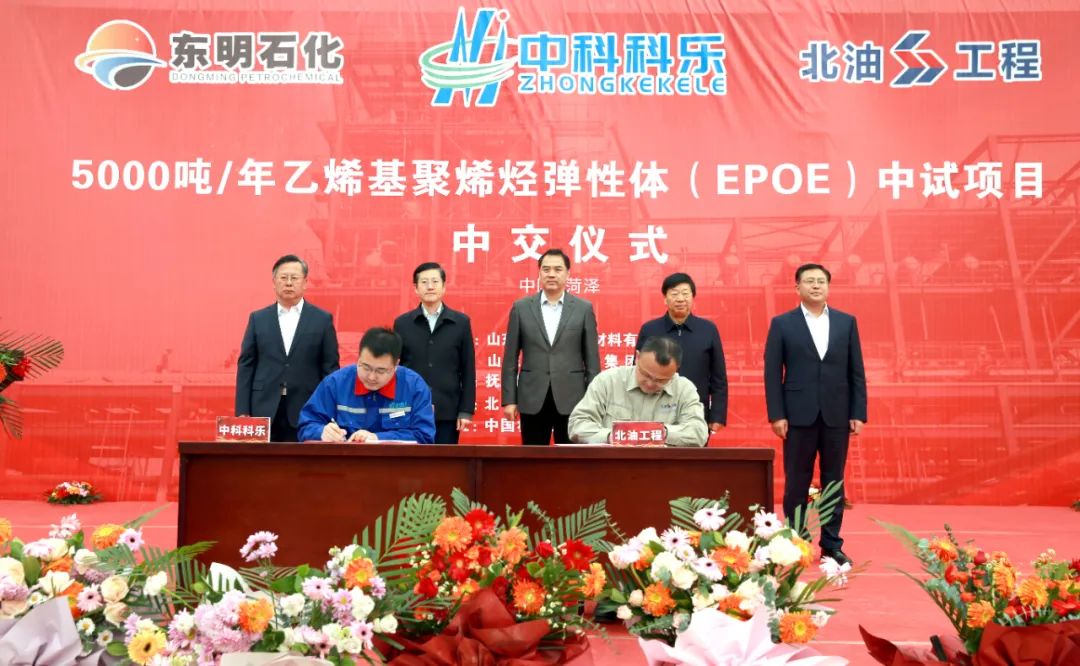 项目现场举行了隆重的中交仪式,菏泽市委常委、秘书长、统战部部长周生宏,东明县委县政府相关领导,合肥中科科乐新材料有限责任公司创始人陈昶乐教授,东明石化集团党委书记、董事局主席李湘平,北京石油化工工程有限公司董事长许缄涛,中国机械工业机械工程有限公司总经理王宏博出席仪式并致辞。北油工程项目负责人与合肥中科科乐签订工程中交证书。